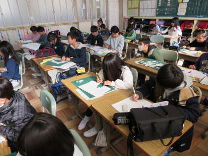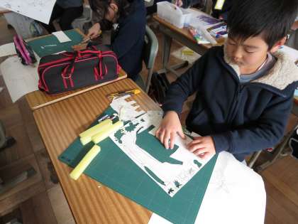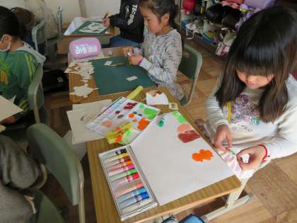 今日の2年1組の4時間目は図工の時間で、「たのしく うつして」という単元の授業で、「ステンシル版画」の教材を使って色鮮やかな作品を作っていました。