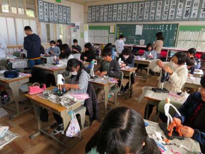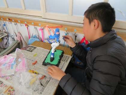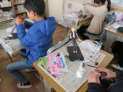 今日の6年1組の4時間目は図工の時間で、昨日の2組と同様に「12年後のわたし」というテーマで針金に粘土を付けて作品を作っていました。すでに着色も終わり、完成に近づいている子どももいました。