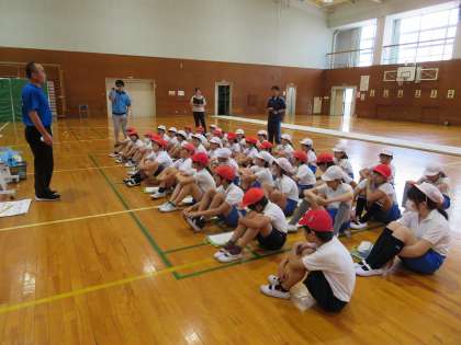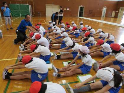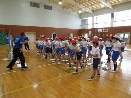 5年1組の3時間目は体育の時間で、2時間目の2組に引き続いて、杉浦校長先生に体力テストの各種目のやり方やコツなどについて指導していただきました。