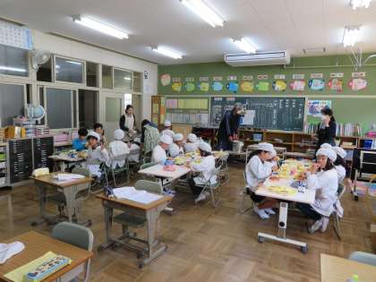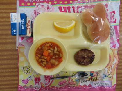 今日の給食のメニューは、クロスロールパン、牛乳、ハンバーグのバジルソースかけ、チキンビーンズ、グレープフルーツでした。平均のカロリーは656キロカロリーです。今日は全クラスの給食の様子をお伝えします。下の写真はわかば学級の給食の様子です。わかば学級では1組から4組まで全クラスが4組に集まって給食を食べています。