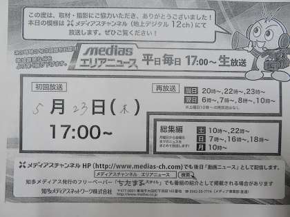今日の防災体験学習の様子は知多メディアスが取材に訪れており、下の写真の日程で放送予定です。