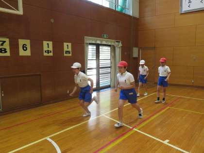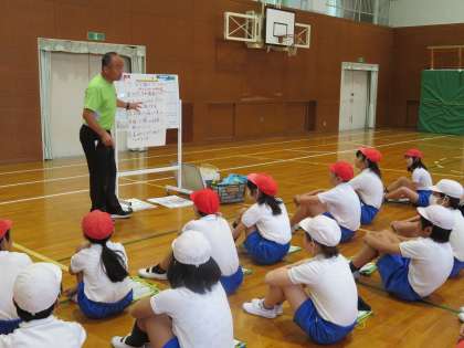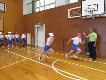 今日の6年1組の2時間目は体育の時間で、体力テストのやり方について練習しました。今日は昨日の5年生に引き続き、体育がご専門の森岡小学校の杉浦校長先生を特別講師としてお招きし、体力テストの全8種目について、やり方やコツなどについて指導していただきました。