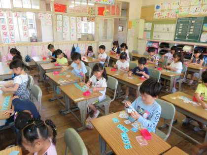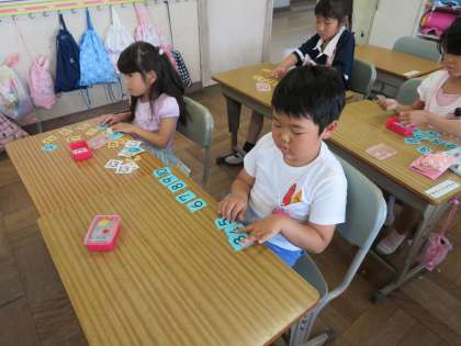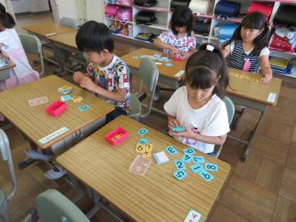 今日の1年1組の2時間目は算数の時間で、「かずと すうじ」の単元の授業でした。今日の授業では10までの数字の書いてあるカードを並べたり、比較したりすることができるようにするねらいがありました。