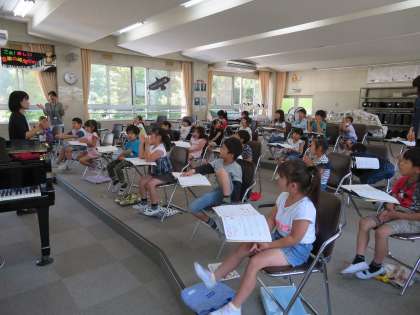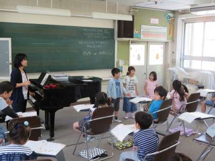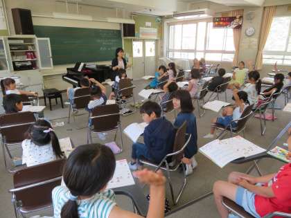 今日の2年1組の3時間目は音楽の時間で、「どうぶつラップであそぼう」とのテーマのもと、リズムに合わせて好きな動物を言い、それに鳴き声で答えていました。