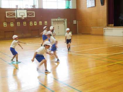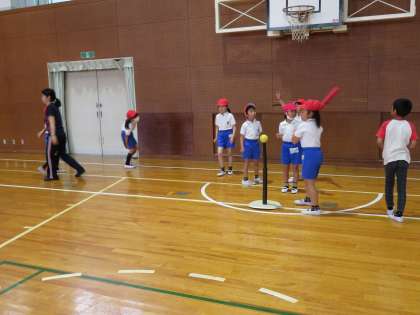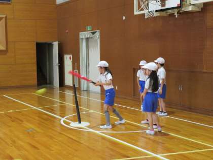 今日の3年1組の2時間目は体育の時間で、体育館でティーボールを行っていました。