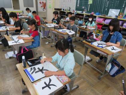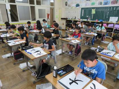 今日の3年2組の3時間目は書写の時間で、「大」の字を書いていました。