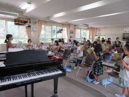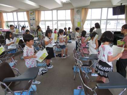 今日の2年2組の4時間目は音楽の時間で、「あの青い空のように」という曲を皆で歌っていました。