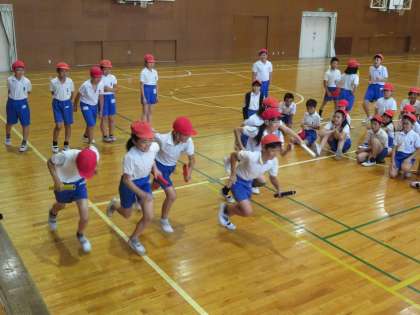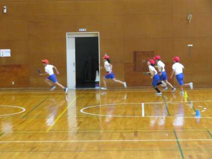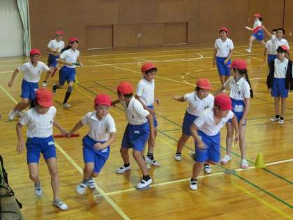 今日の5年2組の4時間目は体育の時間で、体育館でリレーの練習をしていました。