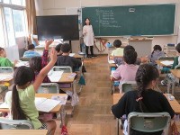 今日の2年1組の5時間目は音楽の時間で、音楽室でピアノの伴奏に合わせ、「やおやの おみせ」の曲を歌っていました。