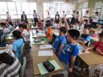 今日の34年1組の4時間目は総合的な学習の時間で、「ふだんのくらしのしあわせ」という単元の授業でした。この授業では障害のある人が幸せに暮らせるために、自分にできることは何かを考える授業でした。この授業は特別な研究授業をとして行われ、他の教員も参観しました。
