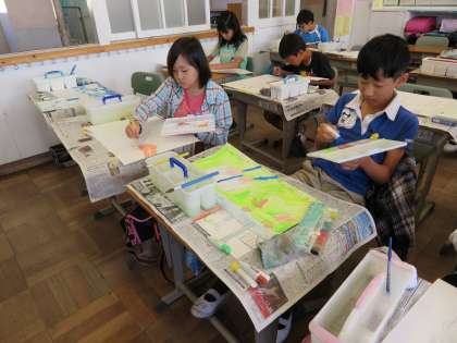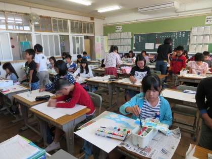 今日の5年2組の1時間目は図工の時間で、「物語から広がる世界」をテーマとした授業でした。これは、物語から想像したことを絵に表す造 形活動で、創造的な思考を深めるねらいがあります。
