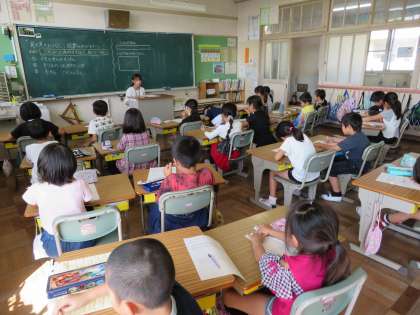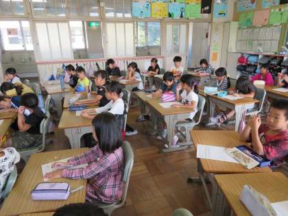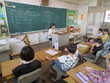 今日の2年2組の2時間目は図工の時間で、「見てみておはなし」という読書感想画の単元の授業でした。このときは、そのために担任の先生が読み聞かせをしていました。