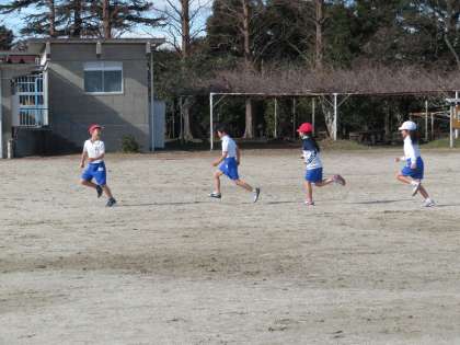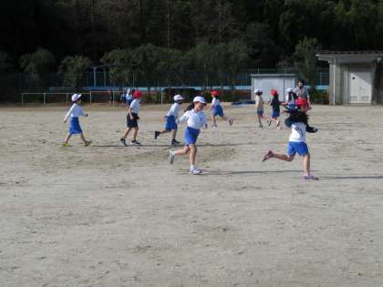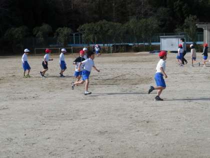 今日の2年1組の3時間目は体育の時間で、このときはグループごとに先頭の子どもについて自由に走るという活動をしていました。