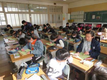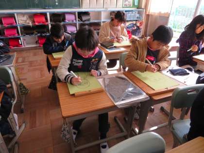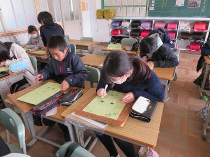 今日の5年1組の3時間目は図工の時間で、「彩色ボード版画」の制作をしていました。