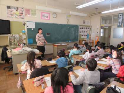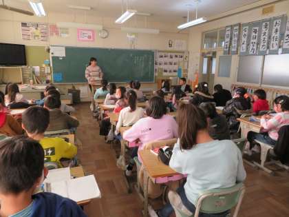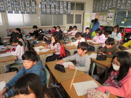 今日の4年2組の6時間目は総合的な学習の時間で、1組と同様に「二分の一成人式」に向けて、「想像してみよう大人の自分」とのテーマで話し合いをしていました。