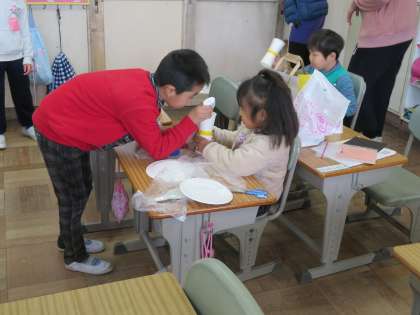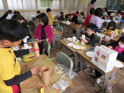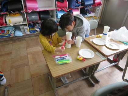 今日の1年1組の1時間目は図工の時間で、、「コロコロ ゆらりん」という単元で、紙コップ等を使った動くおもちゃの制作の続きを行っていました。