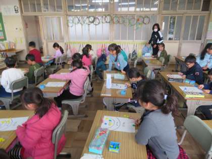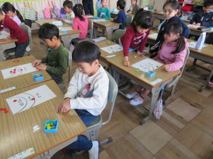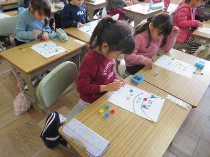 今日の1年2組の2時間目は算数の時間で、「大きいかず」の単元の授業でした。このときは、おはじきを使ってゲーム性を取り入れた計算をしていました。