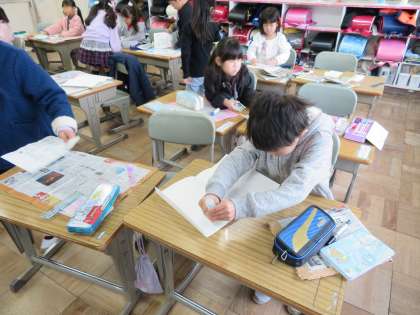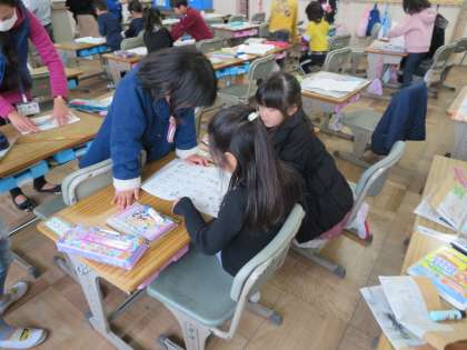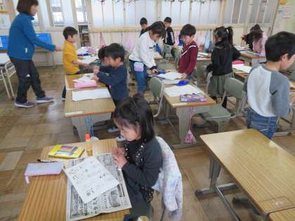 今日の1年1組の3時間目は生活科の時間で、「新1年生を迎える会」の準備をしていました。