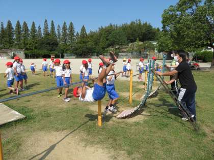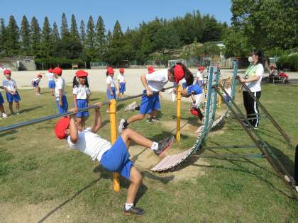 今日の2年2組の2時間目は体育の時間で、鉄棒運動を行っていました。