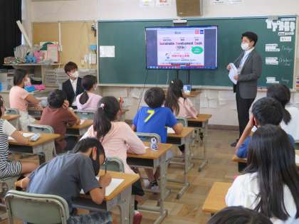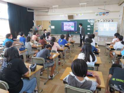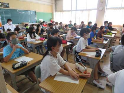 今日の6年1組の5時間目は総合的な学習の時間で、1組と同様に「届けよう、服のチカラプロジェクト」の出前講座を受けました。