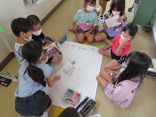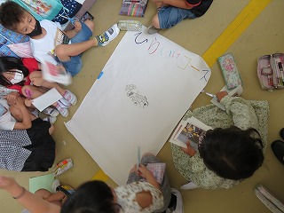 生活科の町探検で見つけたことをみんなでまとめていました。「えきコース」「レインボーコース」「ひらいけコース」の3つのグループに分かれて行いました。どんな発見があったのか、出来上がりが楽しみです。