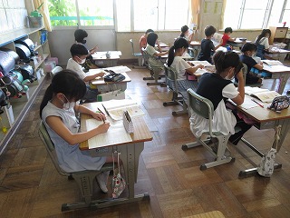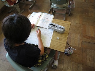 算数でくり上がりのあるたし算の筆算やくり下がりのあるひき算の筆算を勉強しました。今日はそのまとめをしていました。みんな一生懸命計算していました。