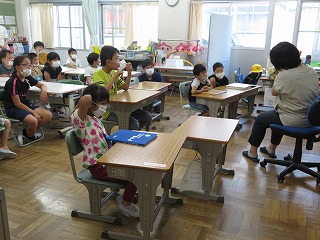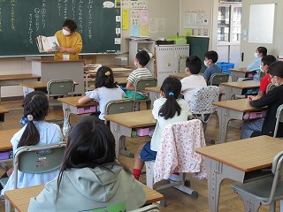 今朝は読み聞かせボランティアの方による読み聞かせがありました。今日は、わかば学級、1年生、3年生です。