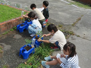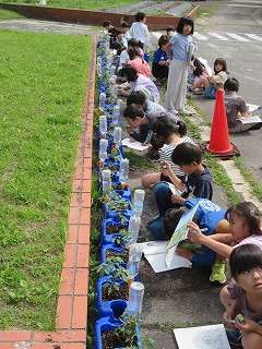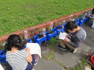 2年生の国語の様子です。国語の時間に生活科で育てているミニトマトの観察記録を書きます。葉の色や形、大きさや匂いなど観察しました。