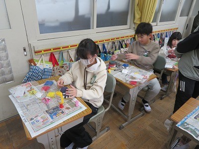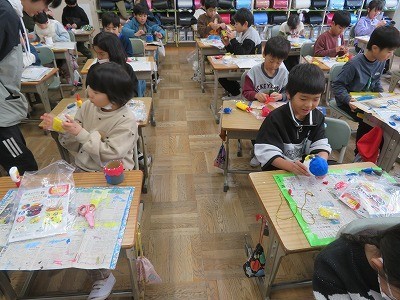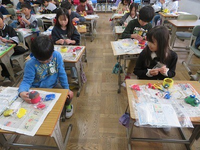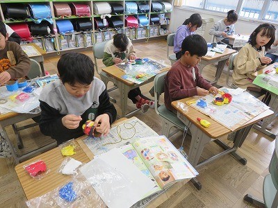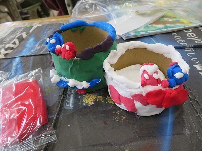 赤・黄・青・白、4色の紙粘土から、いろいろな色の紙粘土をつくりました。