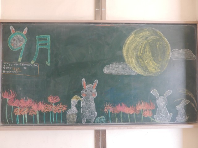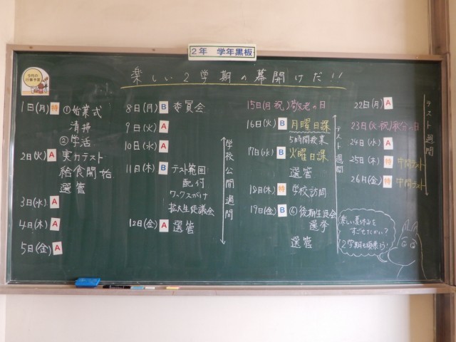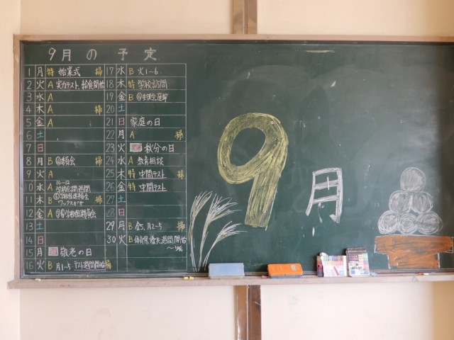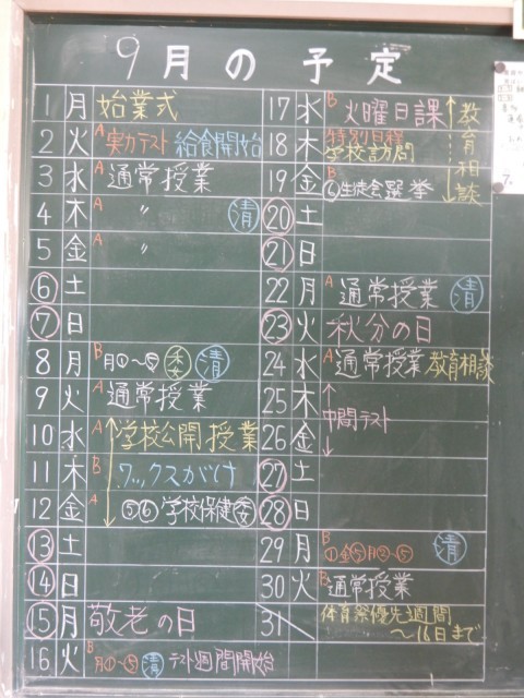 各学年の掲示板です。(9月の予定や美術部の生徒作品)
