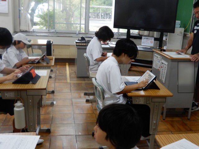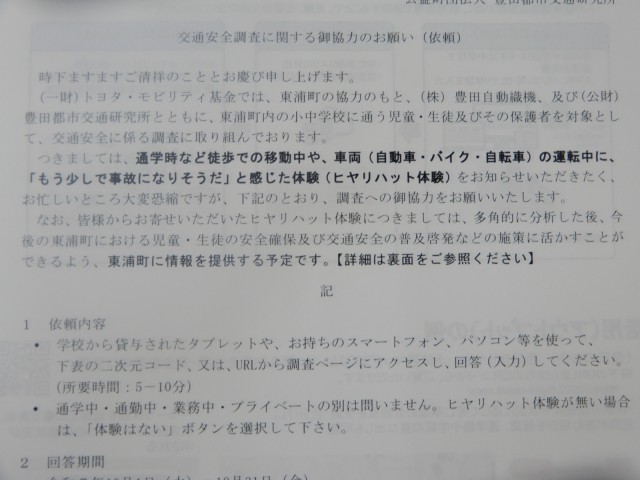 生徒の登下校、地域の方々の日常生活の安全のために交通に関する調査をタブレットを活用して行いました。「通学時などの移動中や車両の運転中にもう少しで事故になりそうだった場所等(ヒヤリハット)」を伝える調査です。生徒は学校でタブレットを活用して行い、保護者の皆様は生徒が持ち帰る用紙からQRコードを読み込みご協力をお願いします。