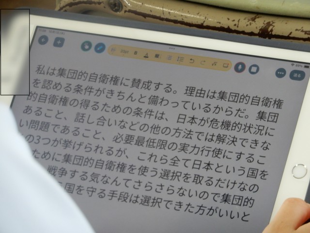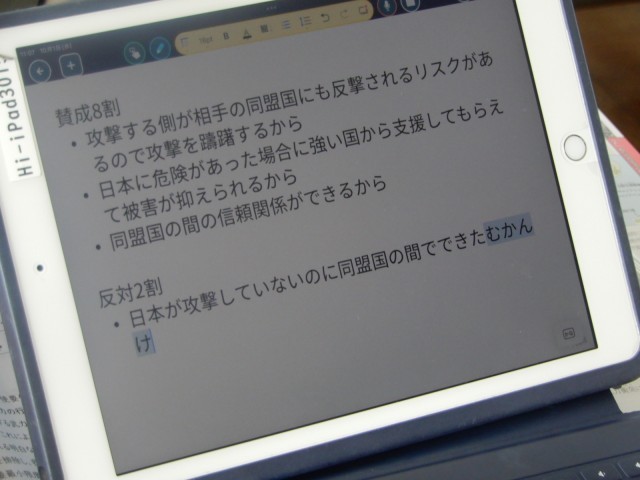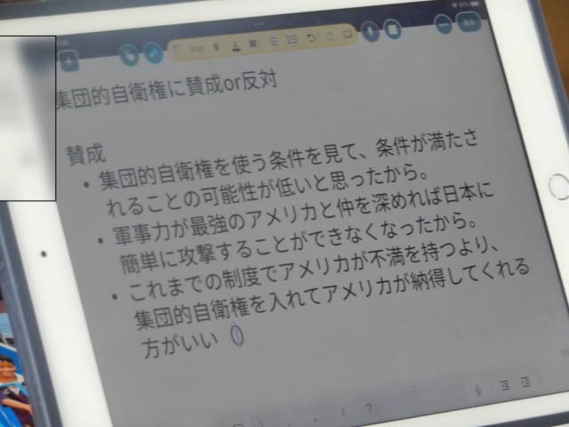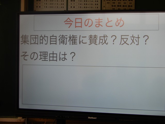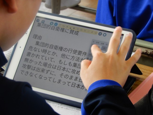 授業のまとめ、振り返りの段階です。「集団的自衛権」について賛成、反対の立場で自分の考えをまとめていました。根拠を示しながら自分の考えをまとめる力がついてきているようです。