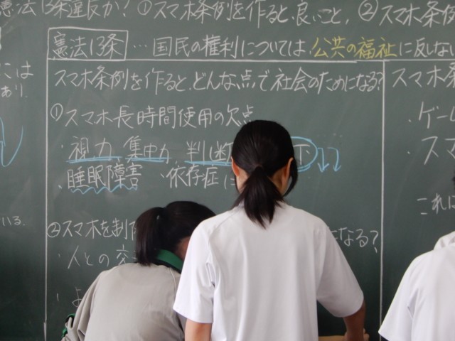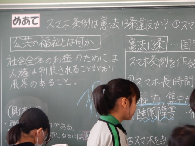 少し前に話題になったスマートフォンの条例を例に、さまざまな視点から合憲なのか違憲なのかについて自分の考えをまとめていました。ご家庭でも話題にしてみてください。
