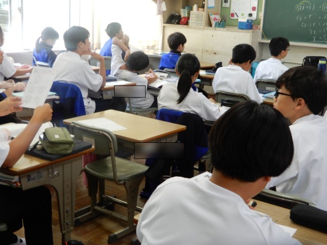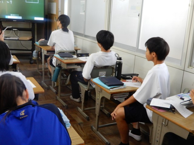 分数をふくむ方程式について学習を進めていました。担当教諭が説明をしているときに生徒から「う~ん わからない」という声が上がりました。授業の中でこういった声を上げやすい雰囲気はとてもよいです。