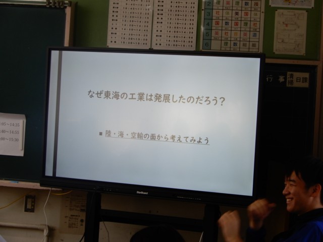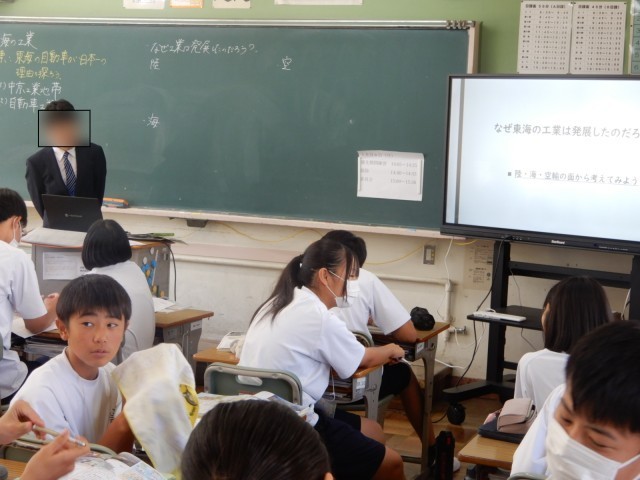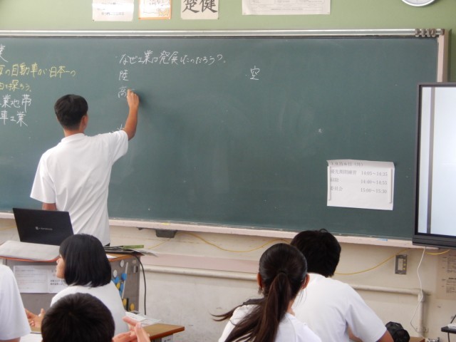 2年生の社会の授業で指導担当が見守る中、教育実習生が授業を行っていました。問いかけに対してなかなか手が上がりませんでしたが、その雰囲気の中一人の男子生徒が自分の考えを黒板に書きに行きました。