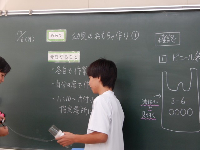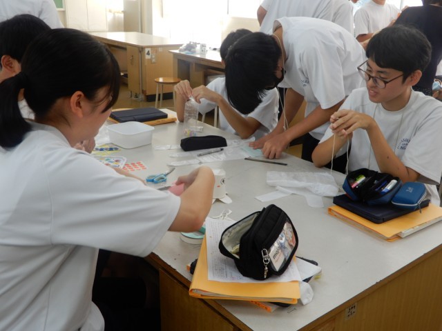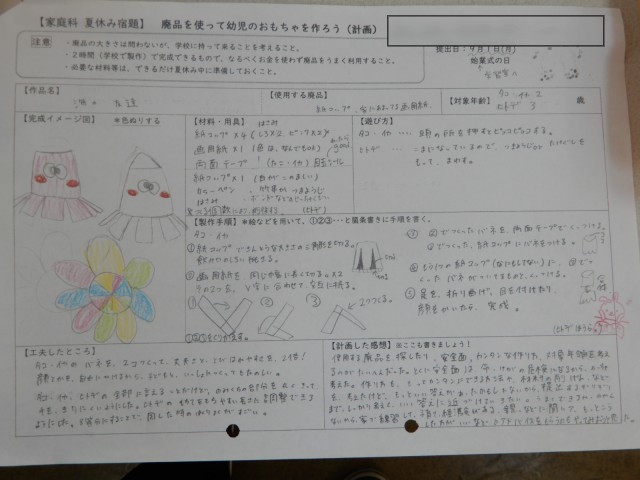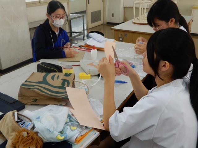 家庭科で幼児のおもちゃを作っていました。段ボールを切ったりシールを貼ったりする平面的なおもちゃもあれば、また動きのある立体的なおもちゃを作る生徒もいるようでした。