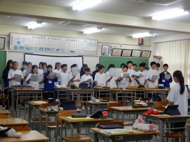 合唱の練習です。まずは並び方からでした。各学級で並び方についても考えてみましょうと担当教員からはなげかけがありました。
