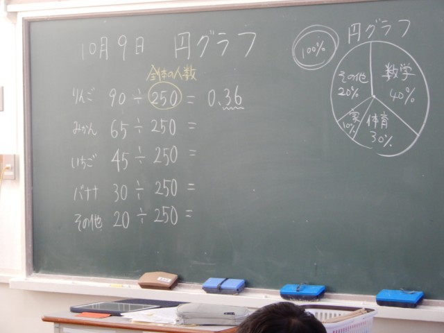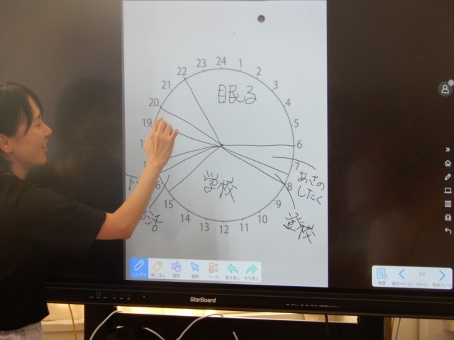 円グラフを使い自分の生活について考えていました。この表を元に、何かをするとき1日のうちの何パーセント使っているのかについても考えているようで慕え。