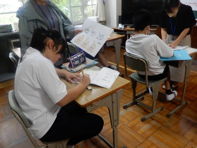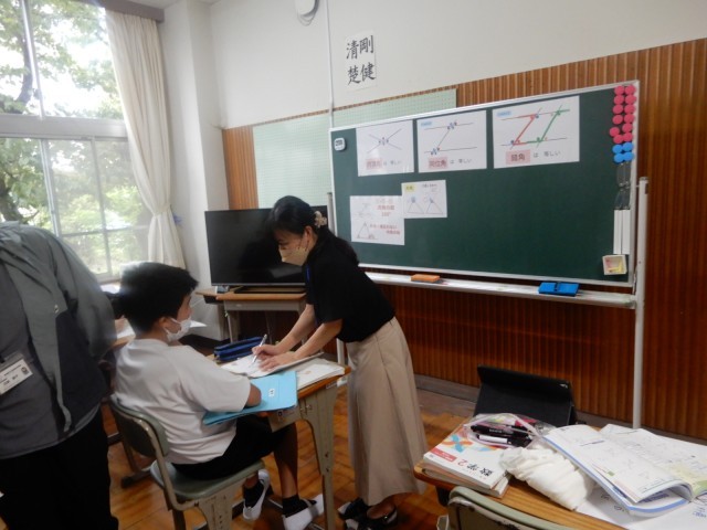 あおば学級の生徒が数学で、錯覚、同位角、対頂角等について学んでいました。それぞれの違いを、パネルなどで確認しながら教えてもらい、自分の中に落とし込んでいるようでした。。