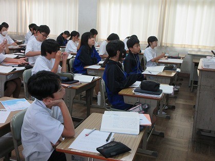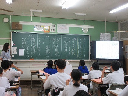 電子黒板に教科書の本文を写しながら、教師が説明をしています。