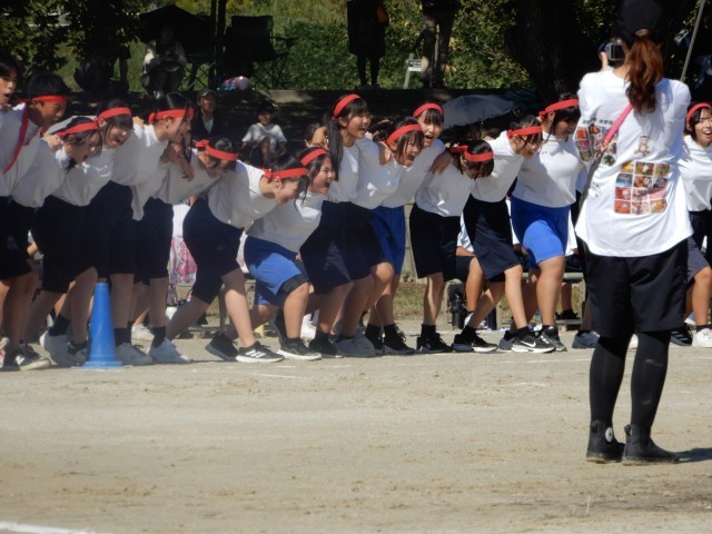 3年の学年種目は「ムカデ競走」でした。トラックを使い長い距離の競走でしたので、動き始めが大切なようでした。