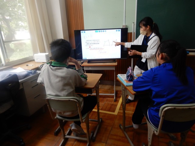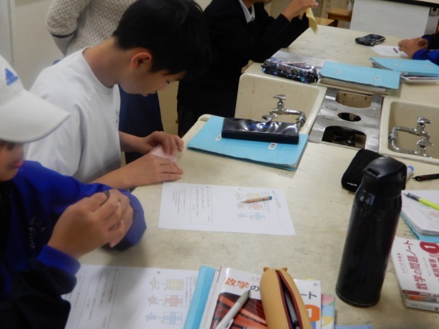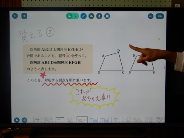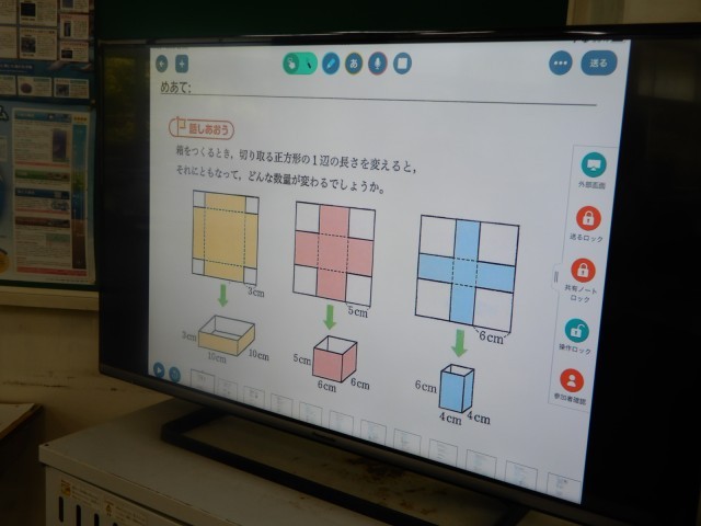 一つのクラスではモニターを活用して合同について学習していました。他の学級では実物大の紙の模型を使いながら、数量の変化について考えていました。さまざまな方法で見える化して考えることはとても大切です。