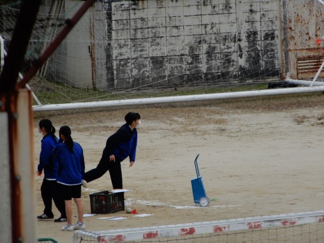 陸上で投げる(ジャベリックスロー)・跳ぶ(走り幅跳び)・走る(800m走)の三種目にチャレンジしています。投げるフォームがよくなってきている生徒が多くなっています。