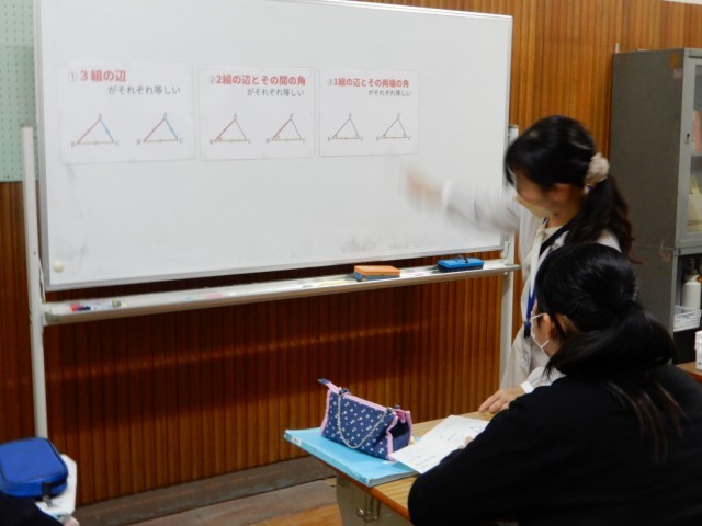 三角形の合同について考えていました。手元にある自分が取り組んでいる問題と黒板に貼られた三つの合同条件をみながら解いていました。視覚的に支援することは大切なようです。