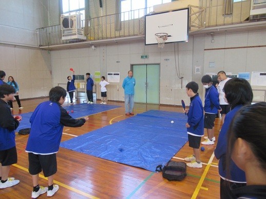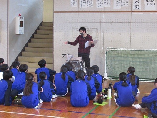 一方、体育館では車いすの説明や車いすバスケット・ボッチャなど、体を動かす体験を行わせていただきました。
