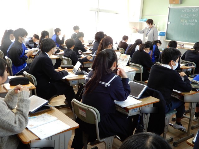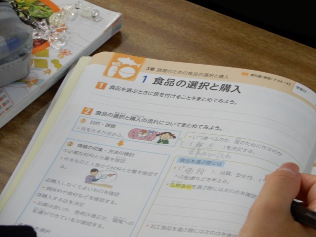 毎日食べている食品の選択と購入について学習していました。生鮮食品はどのように選ぶとよい。加工食品はどのように選ぶとよいなど、普段食べてはいるがあんまり気にすることのない視点で食品について考えていました。