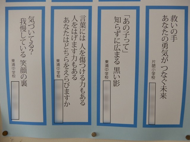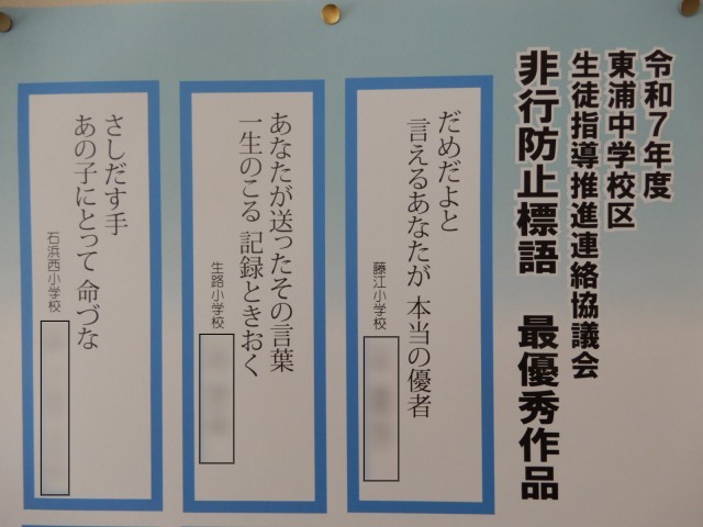 本年度の東浦中学校区 生徒指導推進連絡協議会の非行防止標語の最優秀作品です。校区内の施設等にも掲示してあります。