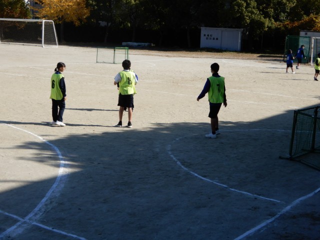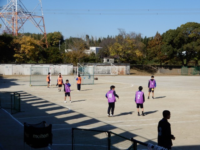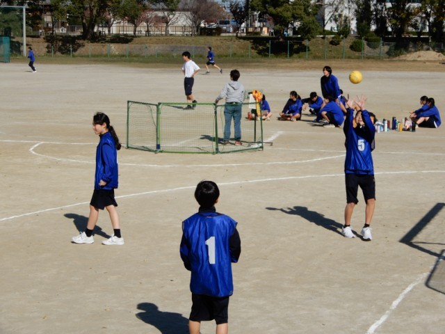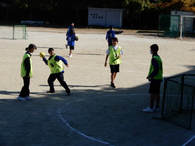 1年生が運動場でハンドボールに取り組んでいました。四人一組のチームで担当の指示を受けた後、自分たちでどのような練習をするのかを考え動いていました。どのように試合をするのかイメージがもてるとよいです。