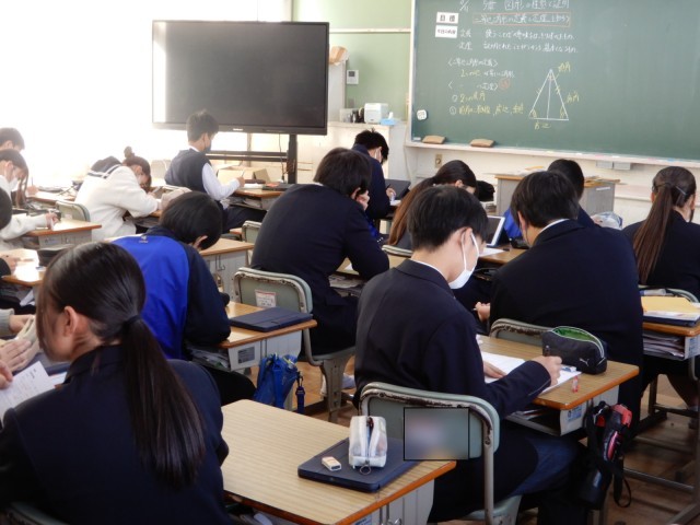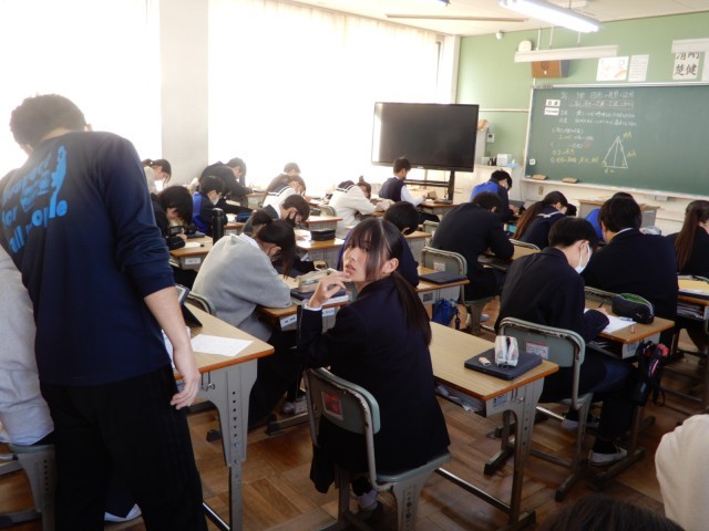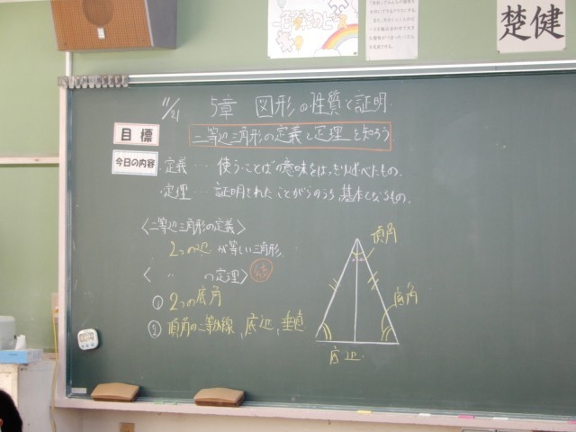 図形の性質を活用して証明することに取り組んでいました。今日は二等辺三角形の定義と定理について学んでいました。まずは基本を理解し覚え、それを応用できることが証明につながっていきます。