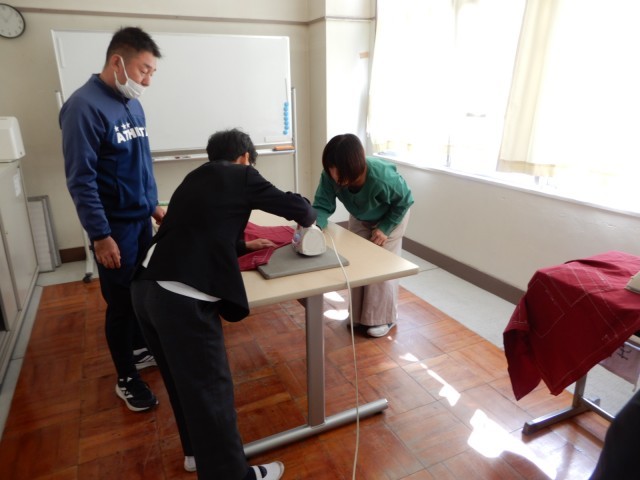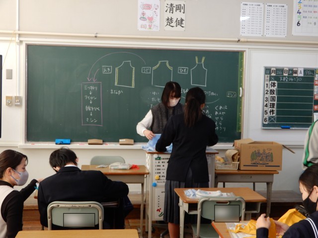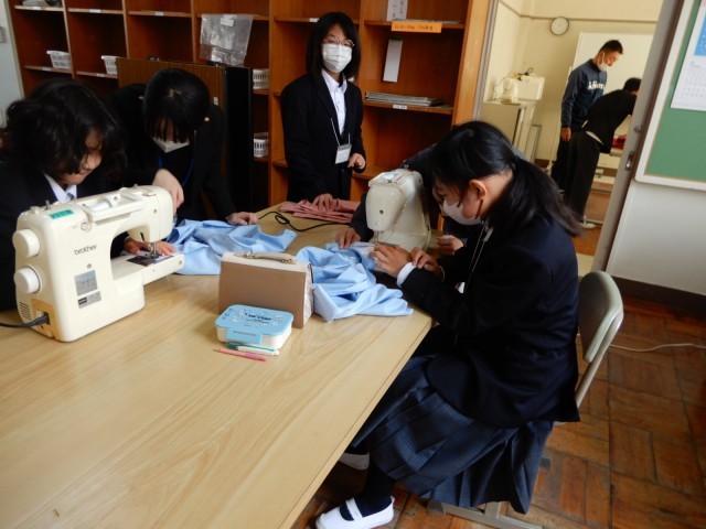 家庭科でエプロンを作成していました。細かい作業をしている生徒が多く見られましたが、丁寧に教えてもらいながら取り組んでいました。